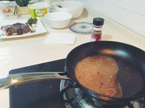 下面要调制酱汁,可以利用煎牛排的余油(很少的话可以再加入一些油),放入洋葱、西红柿块煎香。淋入红酒,加黑胡椒粉,少量盐,酱汁就做好了。