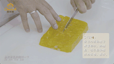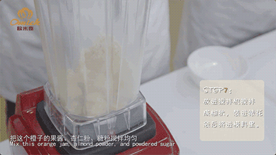 Step6 取出冷冻的橙子果酱切块,加糖粉、杏仁粉和橙皮力娇酒,搅拌;