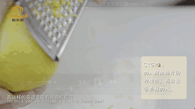 Step2 加入削成碎片的柠檬皮,再取出香草籽加入;